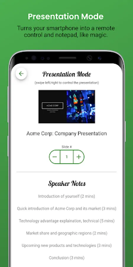 - Your smartphone automatically turns into the remote control for the slides and includes speaker notes: never lose the momentum of your speech