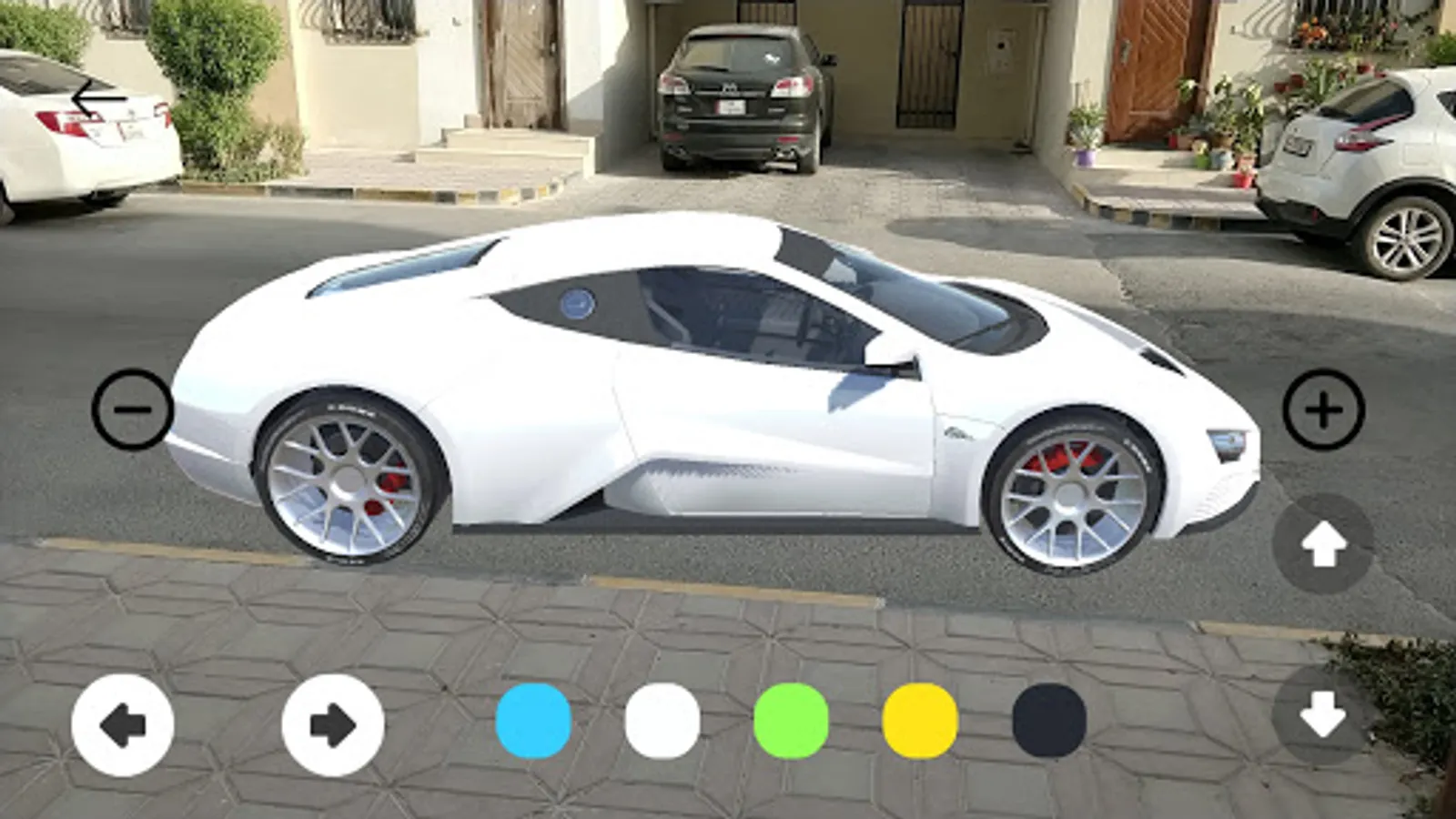 Instruction to Use: Allow the use of camera. Point the phone towards the ground (flat surface) and move the phone around. Once the pointer starts indicating, tap to place the car. Use the arrow keys to move the car. Select color by clicking on the color. Increase the size of the car by clicking on plus icon. Decrease the size of the car by clicking on minus icon.
