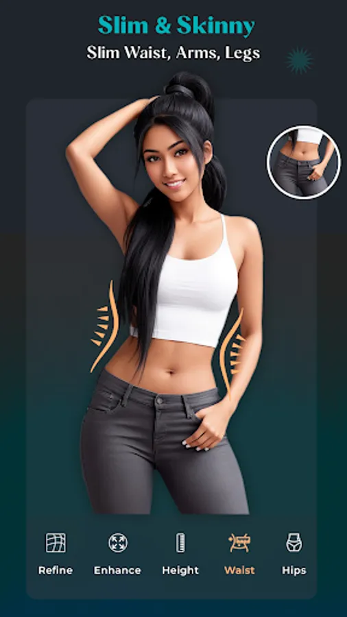 Bring that curve to your belly that you’ve always dreamt of. Use this amazing Perfect Me -Face & Body Editor to slim down your waist line and look an inch smaller without even sweating. This is a slim waist photo editor & slim body photo editor for free.
