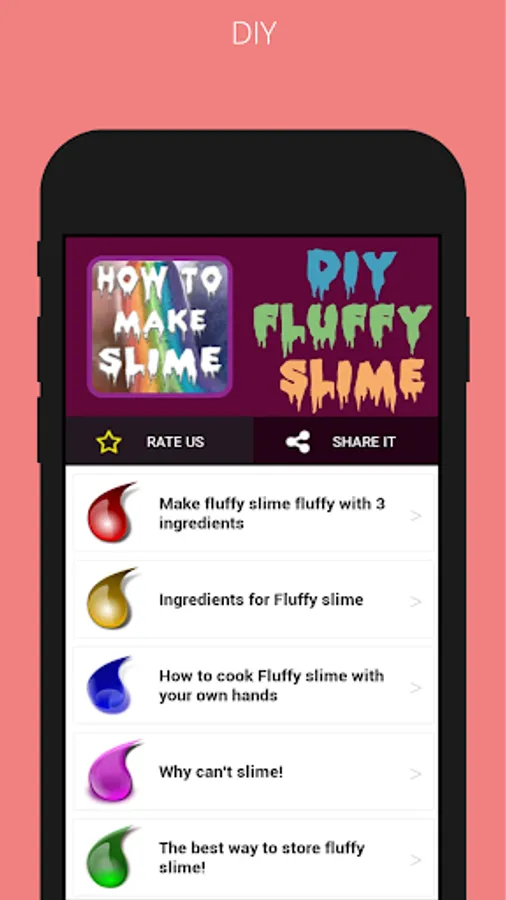 DIY a fluffy slime application in which there are many recipes for how to make slime at home and how to make fluffy slime. All slime recipes are simple and straightforward to prepare.