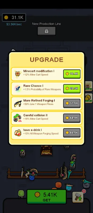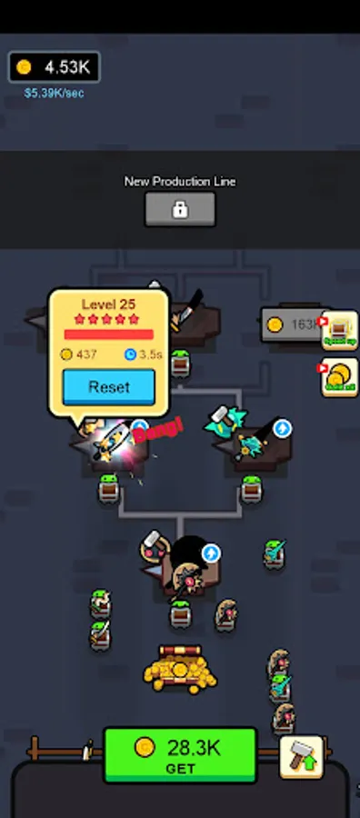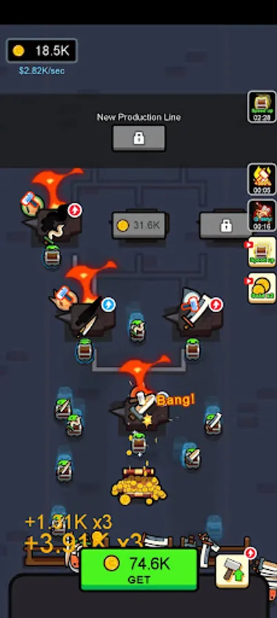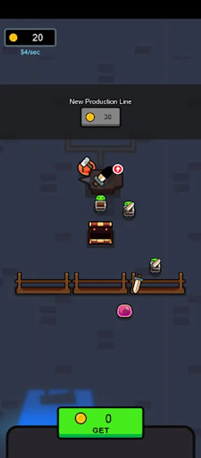 Starting from a small forging table, weapons are shipped and sold, and gold coins are loaded into treasure chests. Upgrade with gold. The higher the grade, the faster it can be built and the higher the price. Open a new production line, ship and sell your weapons, and fill your gold chests!