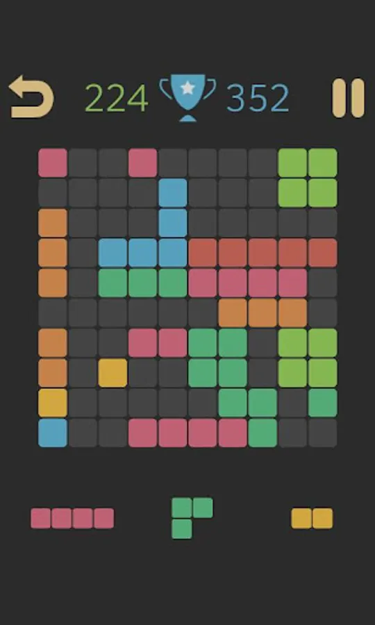 Take one of three blocks and fill the board. Touch and drag blocks to the empty space.
