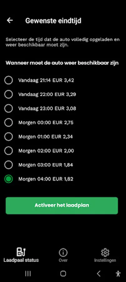 When you have set everything up, it is a matter of starting the loading action, receive a notification, click on this to start the app. Enter the charge status of the car's battery and select when you need the car again in the next screen. You can immediately see what it costs and what you save. If no savings are possible, you will not receive a notification and we will not ask any further questions.