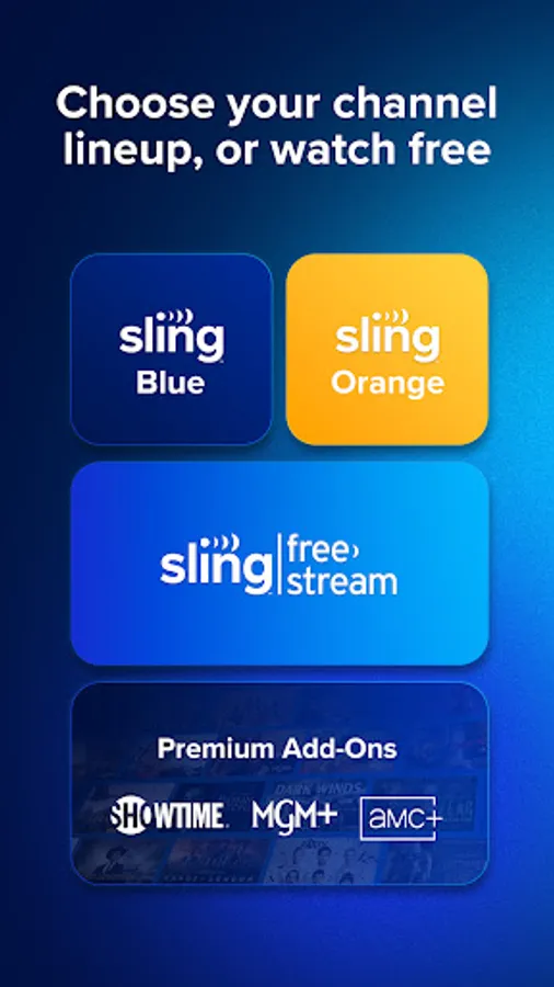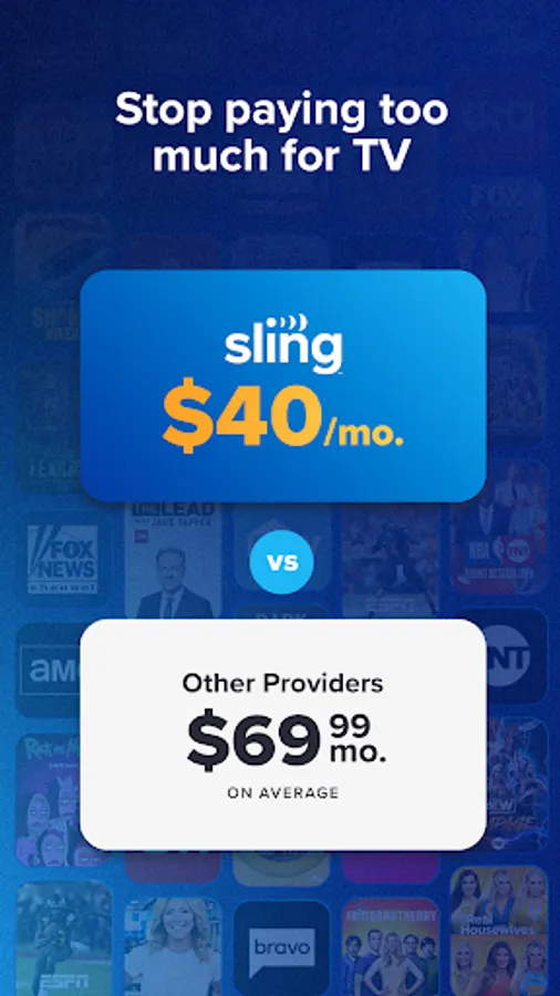 Stream live TV, sports, news, popular shows, movies & more with Sling TV. Customize your channel lineup and explore thousands of movies and shows On Demand. No hidden fees, no long-term contracts, and no more cable. Pause or customize your live TV streaming service at any time. Try Sling Freestream with hundreds of free Live TV channels, no credit card required.