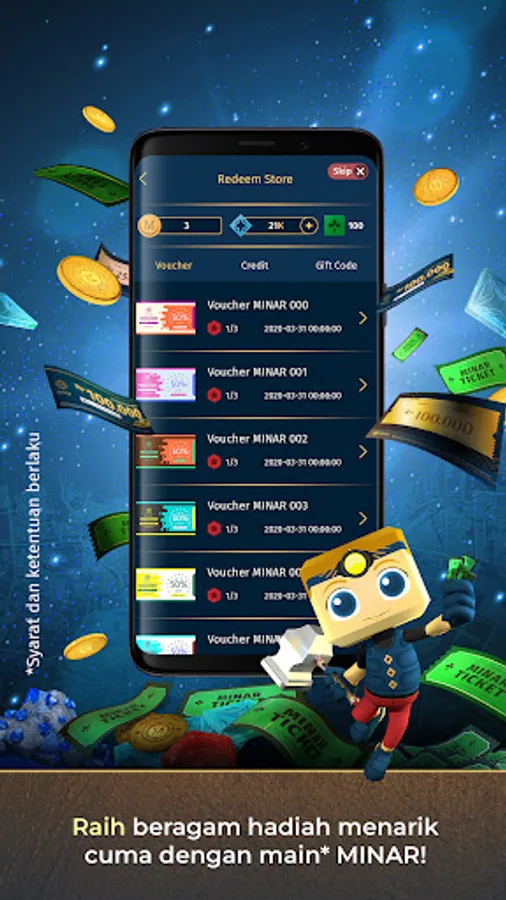 MINAR has 3 kinds of distinct virtual currencies that can be found inside MINAR Stones: Minar Coins, Minar Points and Lucky Tickets. Each virtual currency has its own value and function. MINAR Coin and MINAR Points are used to redeem various kind of attractive rewards from our Reward menu within the application. You will also get a Lucky Ticket every single time you mine a MINAR Stone. Each months top 20 players who collected the most Lucky Tickets will earn another set of additional prizes.