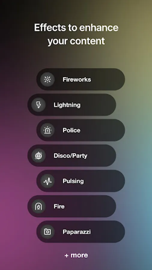 - Experiment with special effects including: police car, disco, fire, strobe, paparazzi, faulty globe, TV, lightning, fireworks and pulsing.