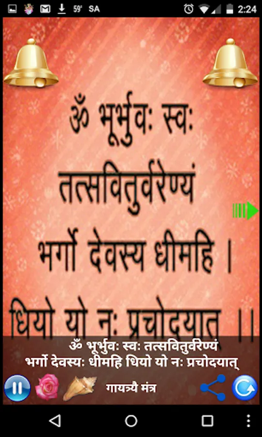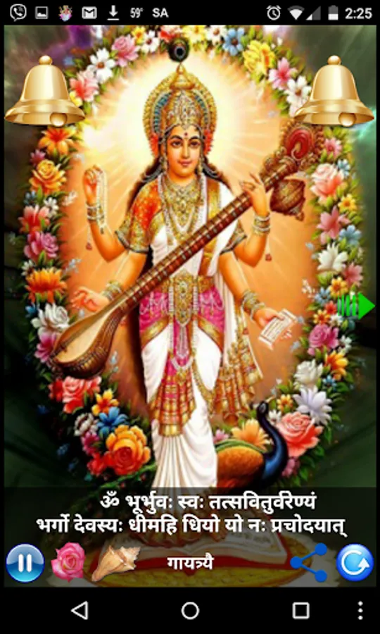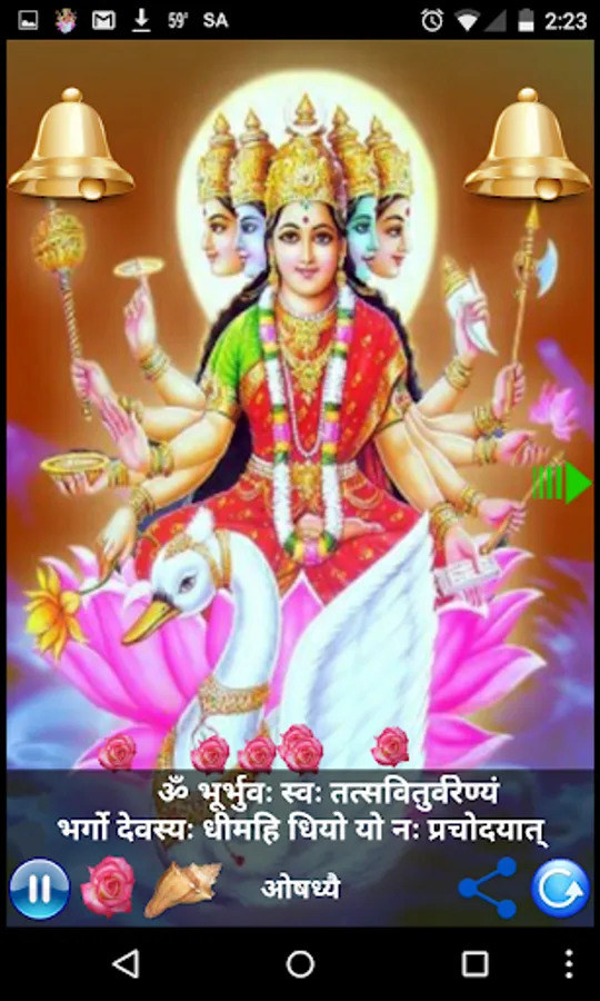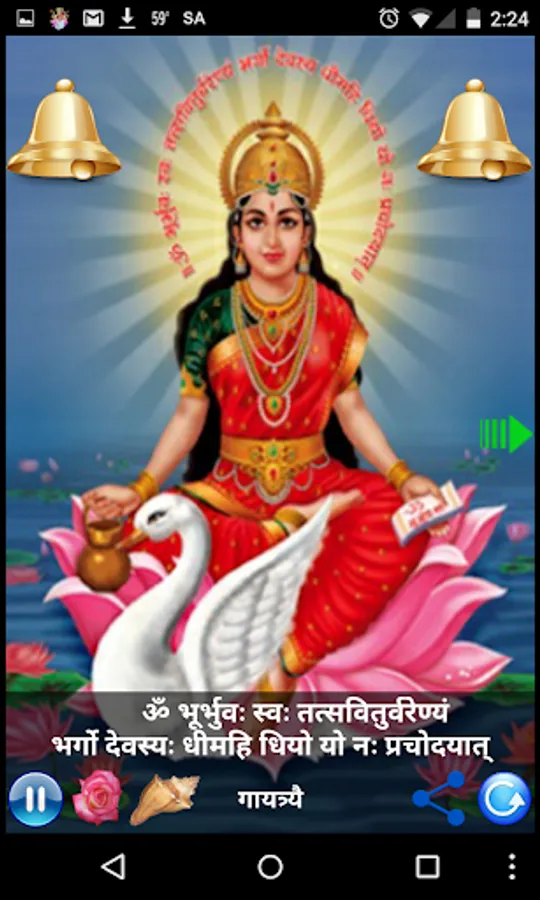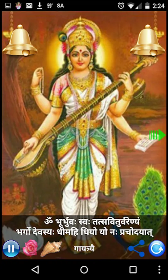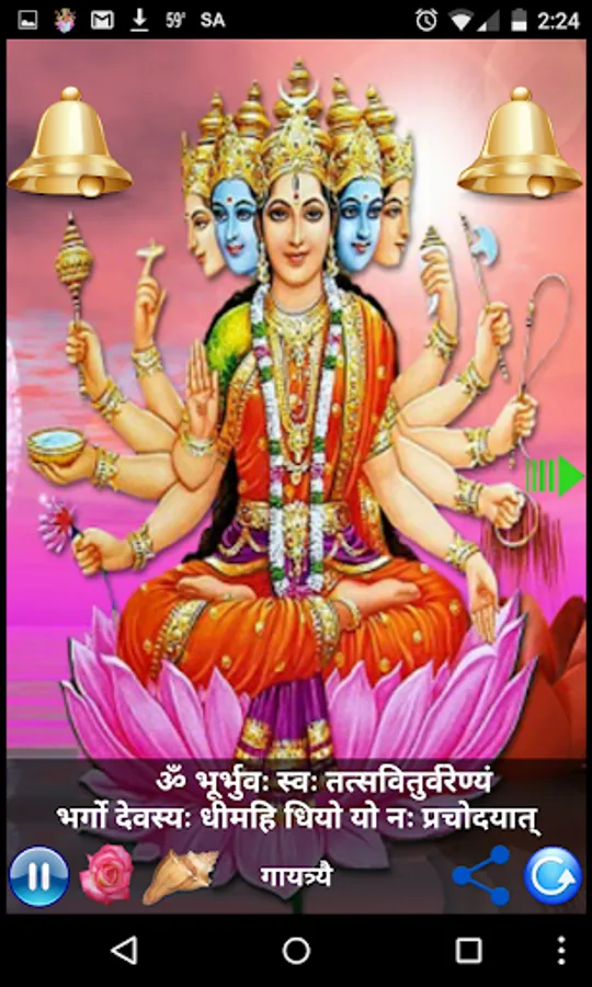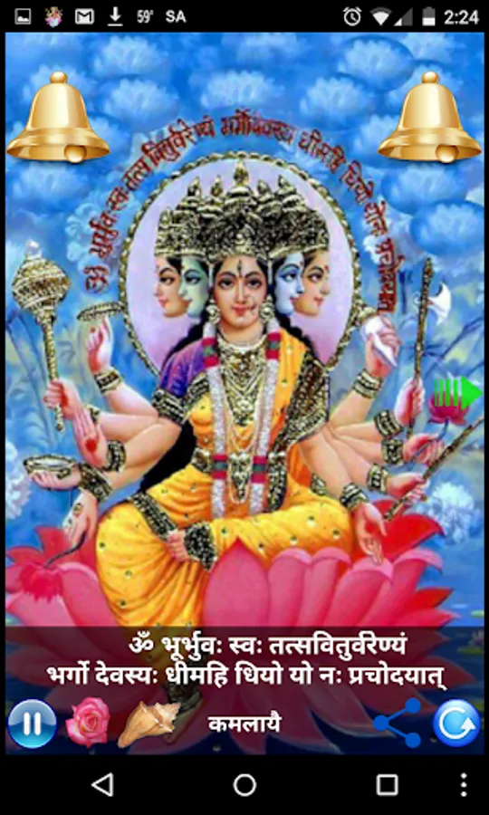 This app contains soothing mantra and lots of moving attractive images of Gayatri Mata. It contains functionality as offering flowers Shower, Bell and Conch Shell with melody. User can auto re-play Mantra via just click on button. This app works fine offline after one time download and installation. User can share the app with your family and friends via share functionality