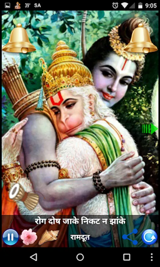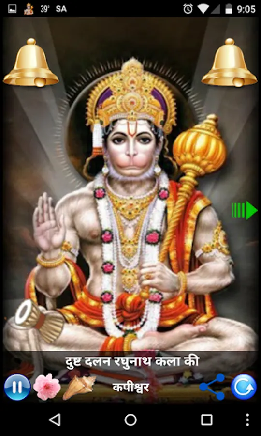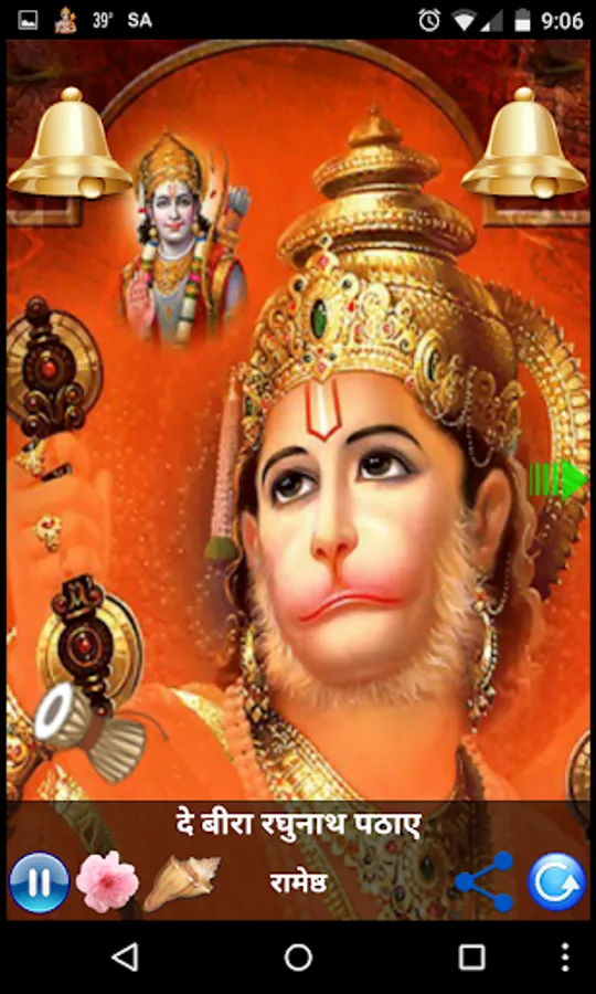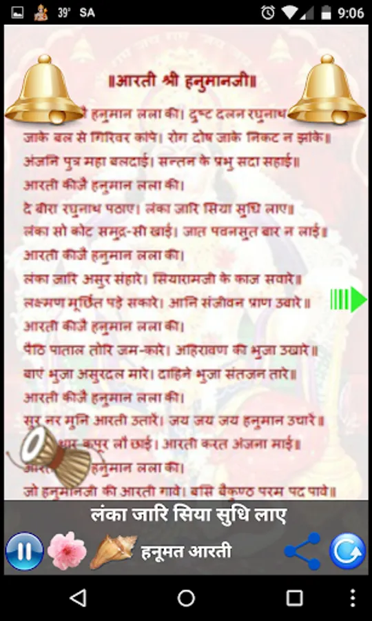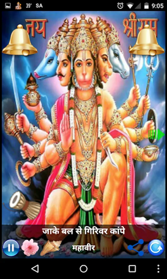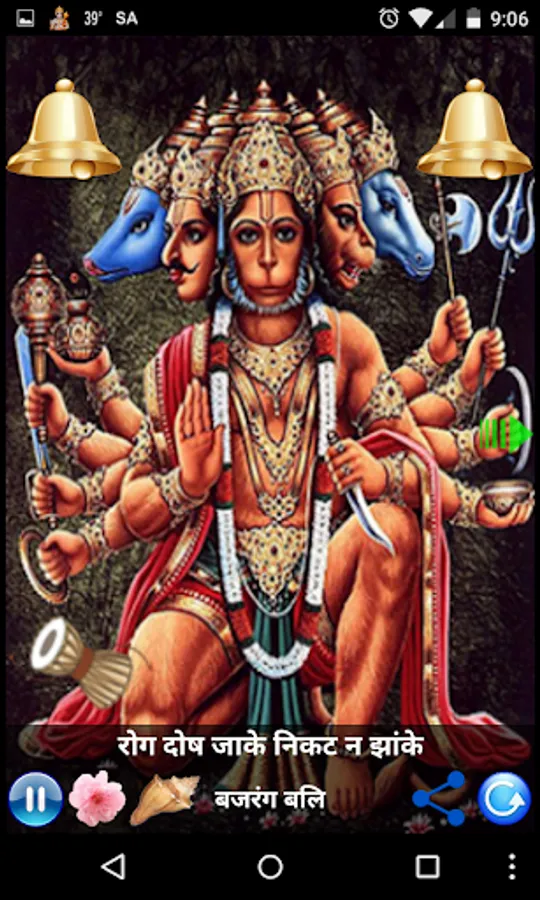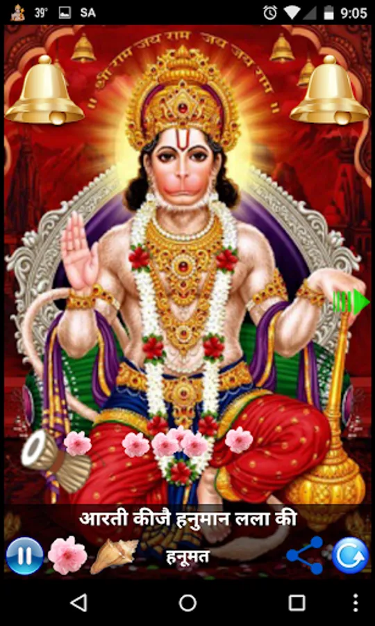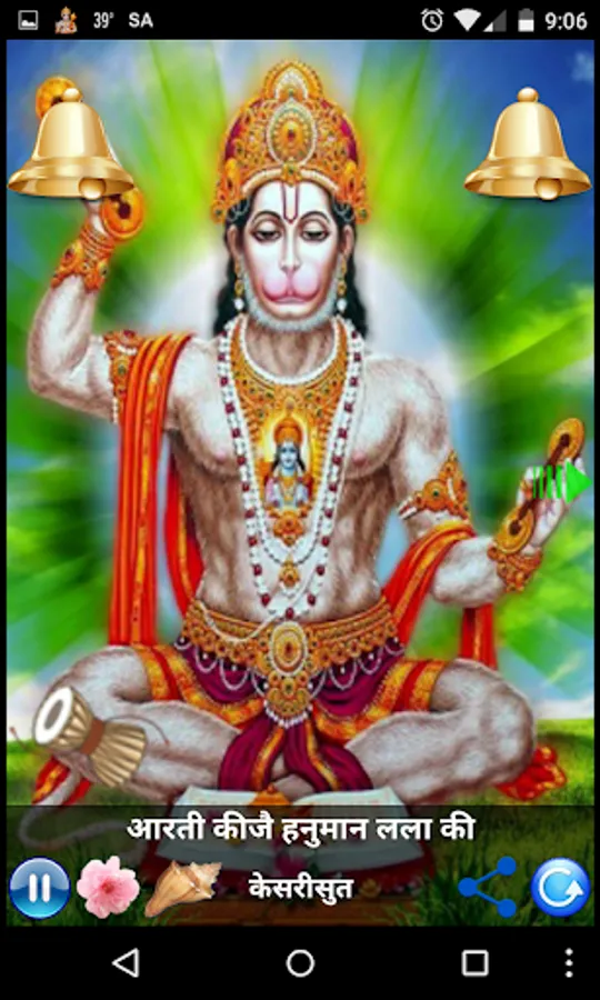 This app contains functionality as offering flowers Shower, Bell and Conch Shell with melody to lord Bajrangbali. User can auto re-play aarti via just click on button.