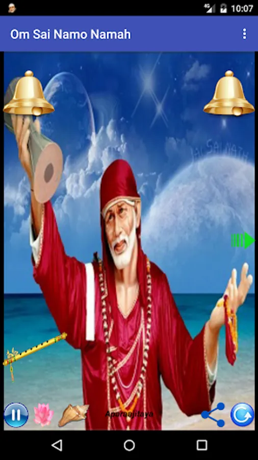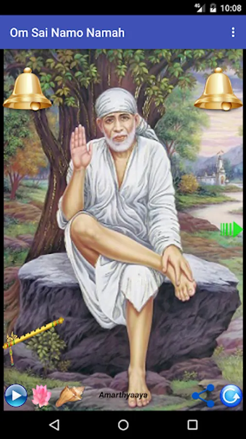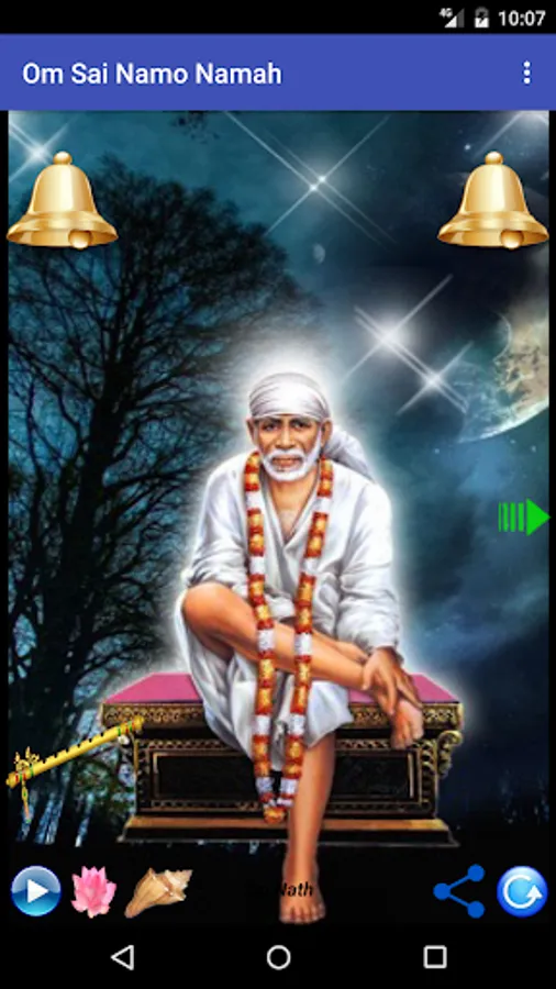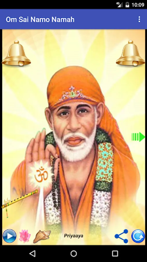 This app contains functionality as offering flowers Shower, Conch Shell and Bell with melody of Sai Namo Namah. User can auto re-play via just click on right hand replay button.