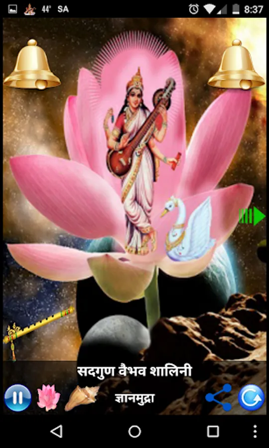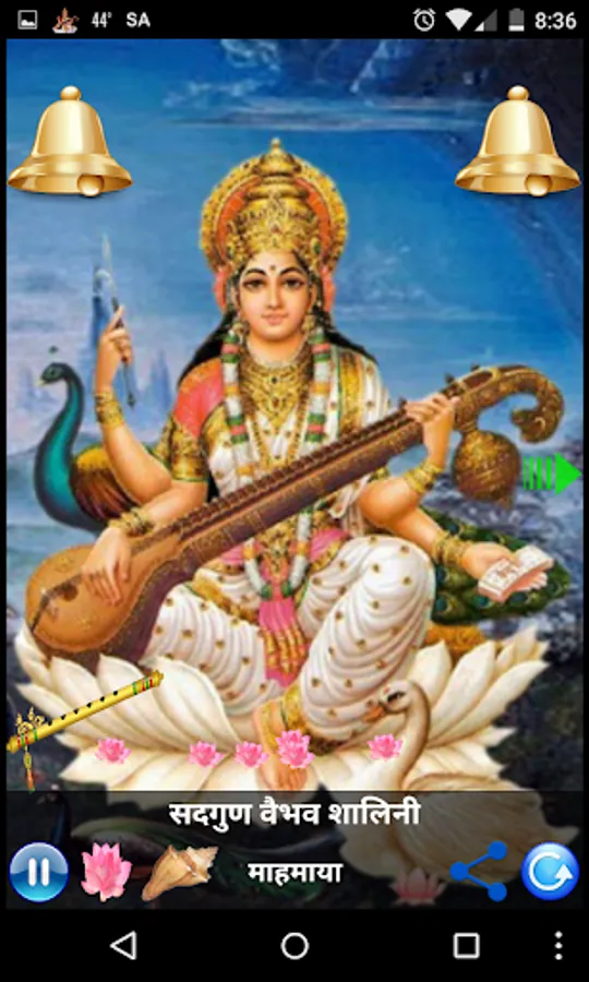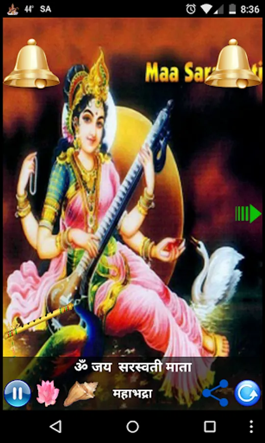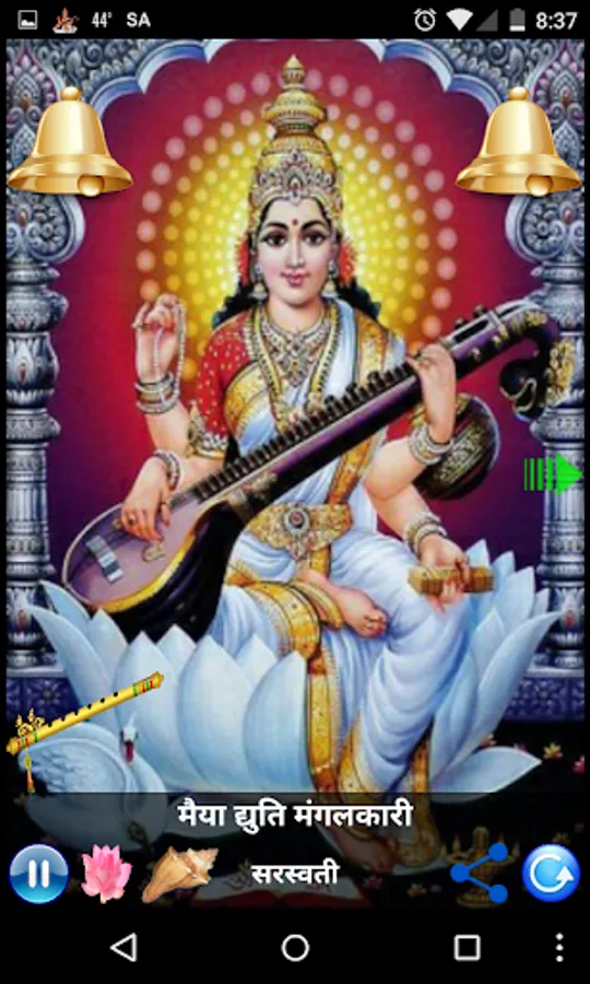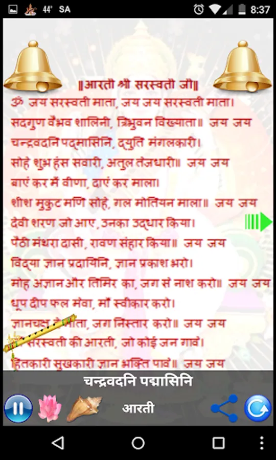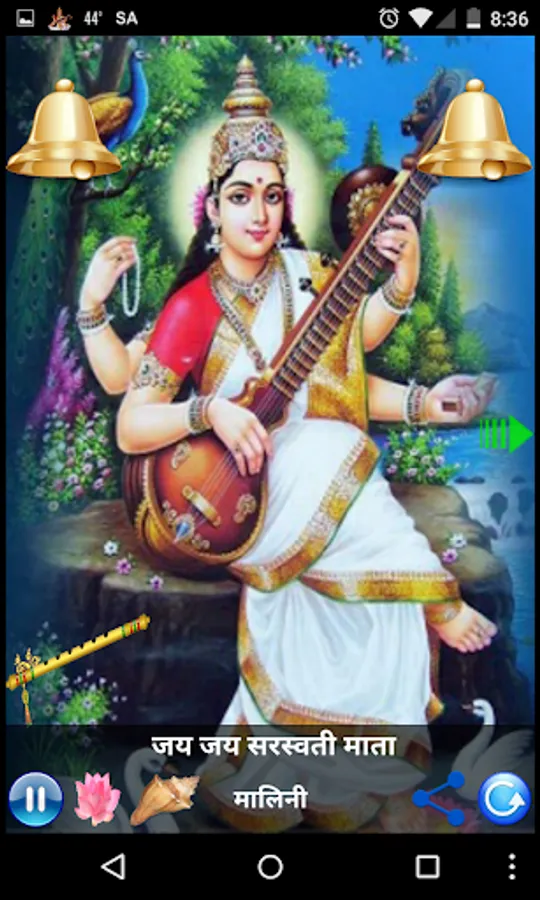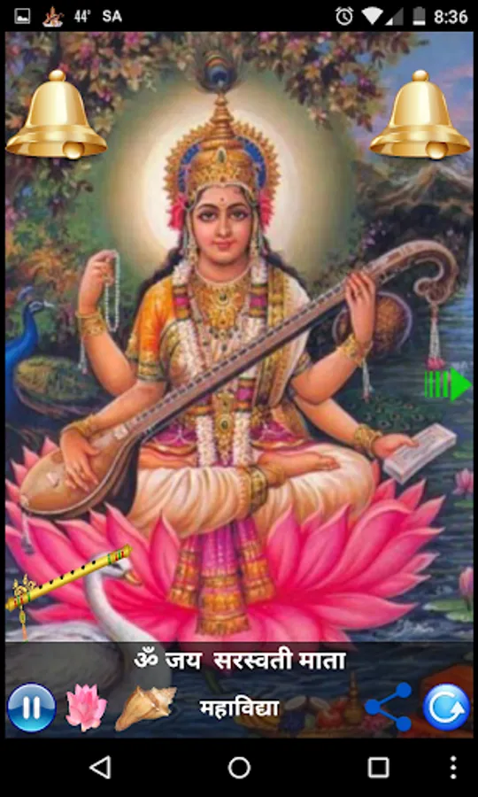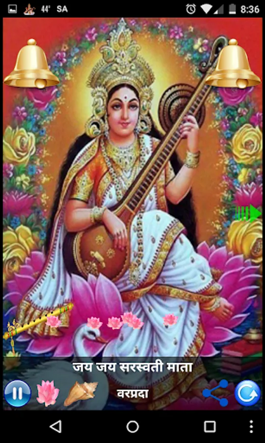 This app contains functionality as offering flowers Shower, Bell and Conch Shell with melody to goddess Saraswati. User can auto re-play aarti via just click on button.