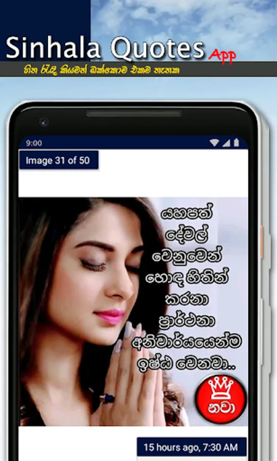 Sinhala Quotes App is a FREE mobile App that brings you inspiring and motivational Sinhala quotes on a hourly basis. Success, Love, Life, Advice, Funny, Friendship, Hope, Poems.. all in one app.