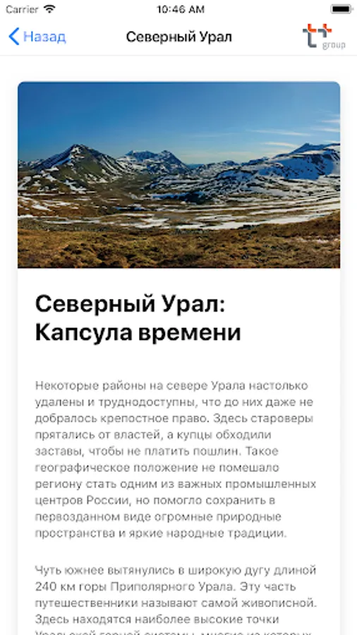 In the application “Ural. Modern guidebook ”you can find the most interesting facts about the climate, history, cuisine, cities, natural, cultural, industrial and other sights of the Northern, Middle and Southern Urals, useful information about transport, hotels and restaurants. The publication has a unique feature: those who know them better than anyone else share their impressions of the most interesting objects: employees of T Plus, who live and work in various cities in the Urals and in the Volga region.