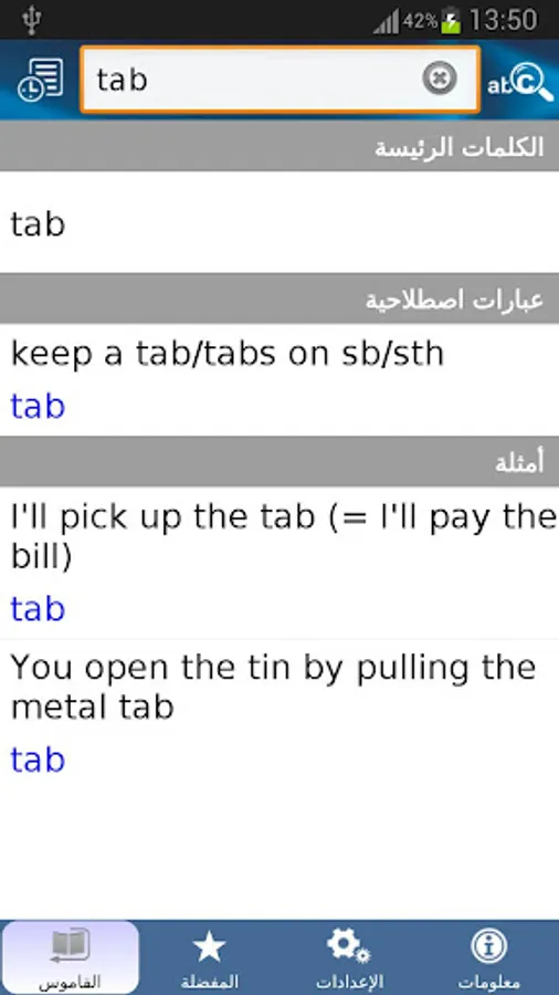 اضغط على أية كلمة في تعريف أو جملة توضيحية ليأخذك القاموس إلى معناها مباشرة•