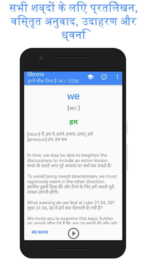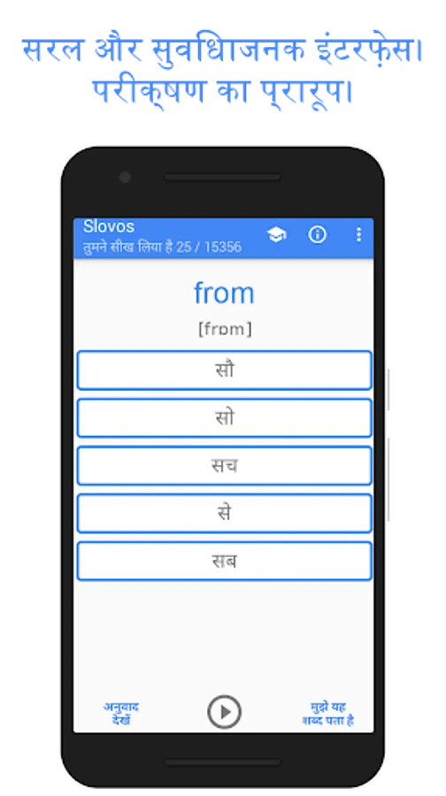 Learning English words with Slovos app is easy. If you are going to learn English, first you need a good terminology to learn grammar and other rules quickly and as a result the reporters understand and speak clearly. The app contains 15,000 most popular English words. Training starts with the most popular. While sorting used vocabulary core in modern English and American languages, which includes the content of various topics. Therefore, if you learn English words using the Slovos app, you can read and understand most of the articles, news, books, movies or dialogs easily.