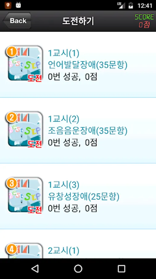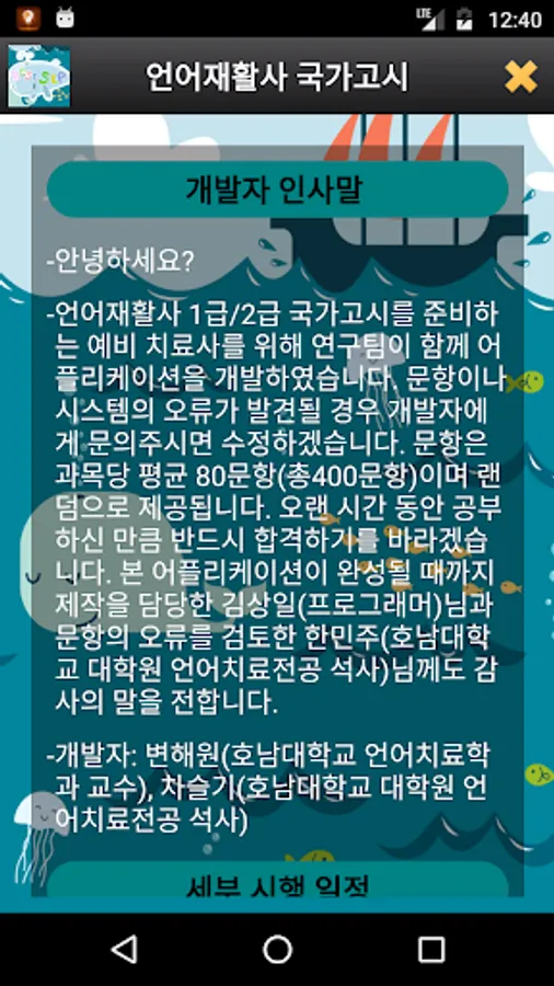 언어재활사 1급/2급 국가고시를 준비하는 예비 치료사를 위해 연구팀이 함께 어플리케이션을 개발하여 무료로 배포합니다. 2020년 4월 20일자로 문항 수정과 앱 사용시 오류를 수정한 version 2를 배포합니다. 향후 문항시스템의 오류가 발견될 경우 개발자에게 문의주시면 수정하겠습니다. 문항은 과목당 평균 80문항(총400문항)이며 랜덤으로 제공됩니다. 이 앱은 완전히 비영리적 목적으로 개발되었으며, 광고를 포함하지 않습니다. 오랜 시간 동안 공부하신 만큼 반드시 합격하기를 바라며, 많은 분들께 도움이 되길 희망합니다.