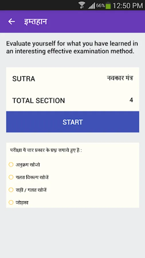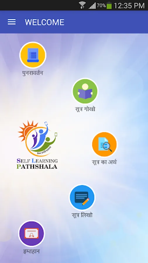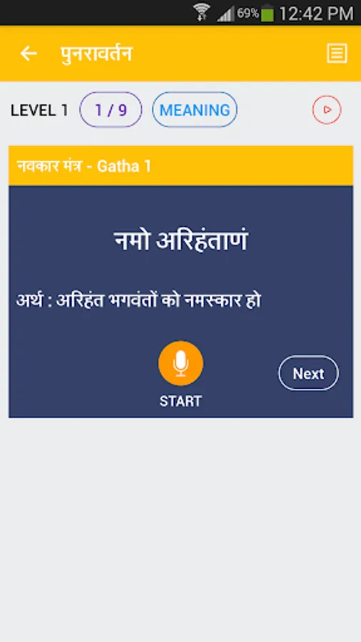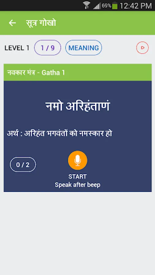It has a structured method of Listening to the Pronunciation, revising with Speech recognition option, writing practice on the device, interactively providing the meanings of the Sutras and ultimately giving exam to check your level. It guides you very closely and strengthens your knowledge unknowingly.