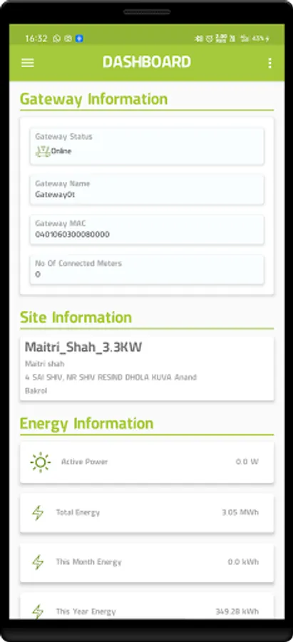 Gateway will provide us quick information regarding Gateway Status, Active Power, Today Energy, and Inverter details.