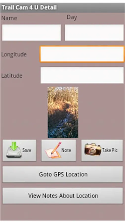 Enter daily notes about the events that happen at each of your trail camera locations. Enter whatever you want like date, time, weather conditions, wildlife, picture descriptions, etc... You can review these historical notes for all trail camera locations. The locations of your trail cameras or events are viewable from the application on your phone via google maps. All current and historical locations are mapped.
