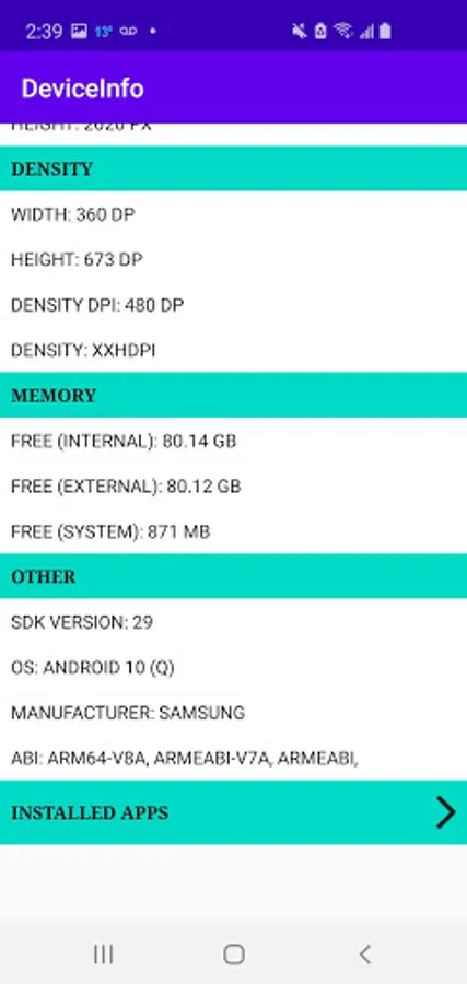 Easy way to find your Device Screen Resolution, SDK and OS versions, AAB, Free Memory, Installed Apps and All permissions requested by Installed Apps.