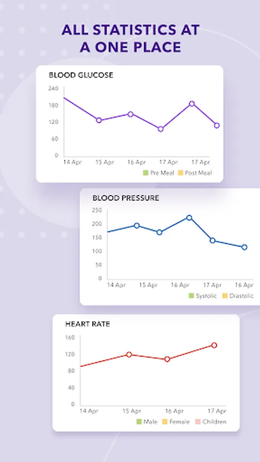 Maintain a data of your Blood Pressure, Blood Sugar & Heart Rate to keep track of it. This data can seen in graphical & statistical form.