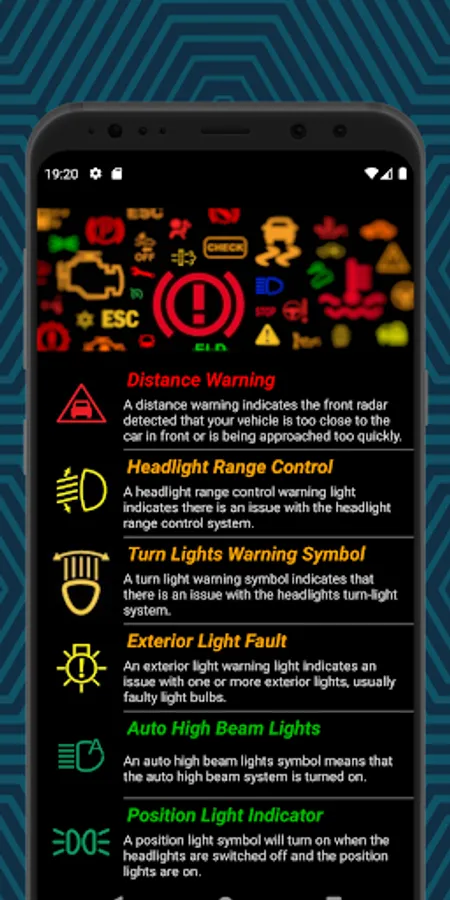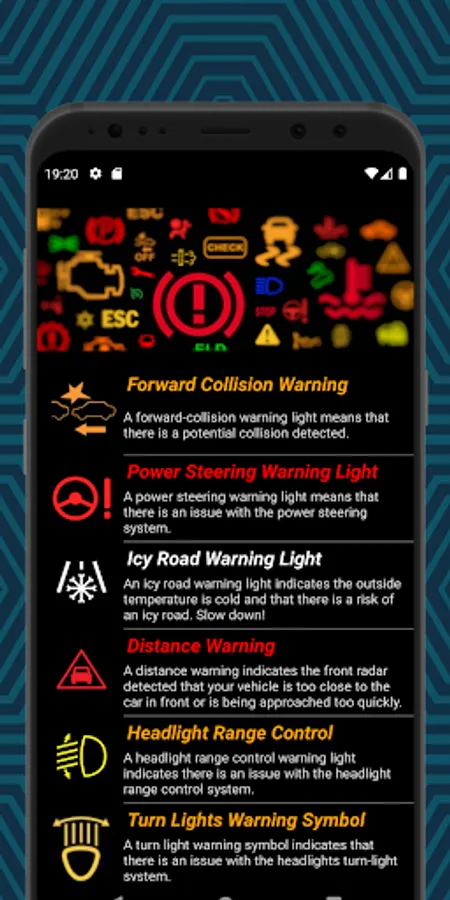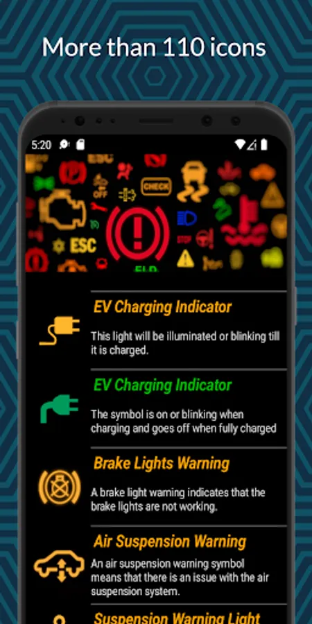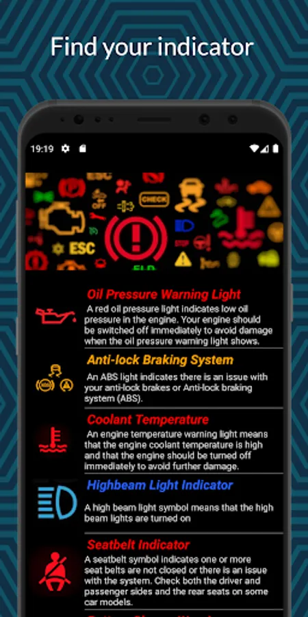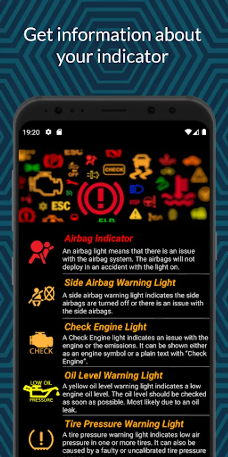 More than 100 car dashboard symbols in one application. Their description will help you quickly understand what is happening with your car.