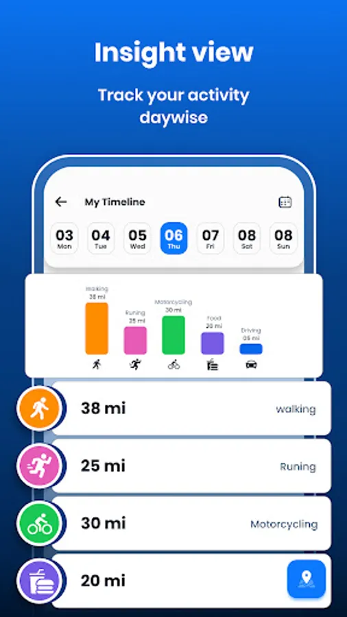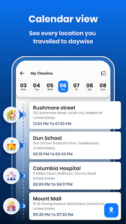 1) My Timeline: In this feature, you will see a list of days & calender view to get the whole day's location details by selecting any date. Check full timeline track of your whole day with location address.