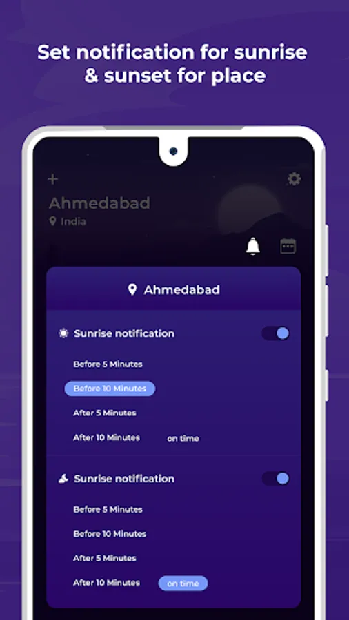 - Set notification for sunrise/sunset time and also have option to set different timing for notifications.