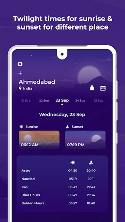 - Display current city sunrise & sunset time along with twilight time and details like astronomical, civil, nautical,blue hour and golden hour sunrise sunset time.
