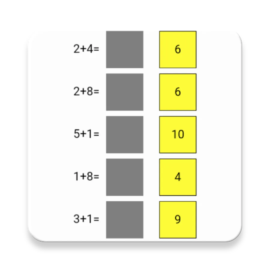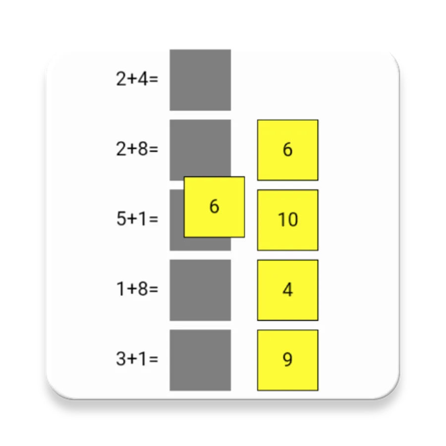 An app for learning addition with sums up to 10. Drag and drop the answers in the correct place.