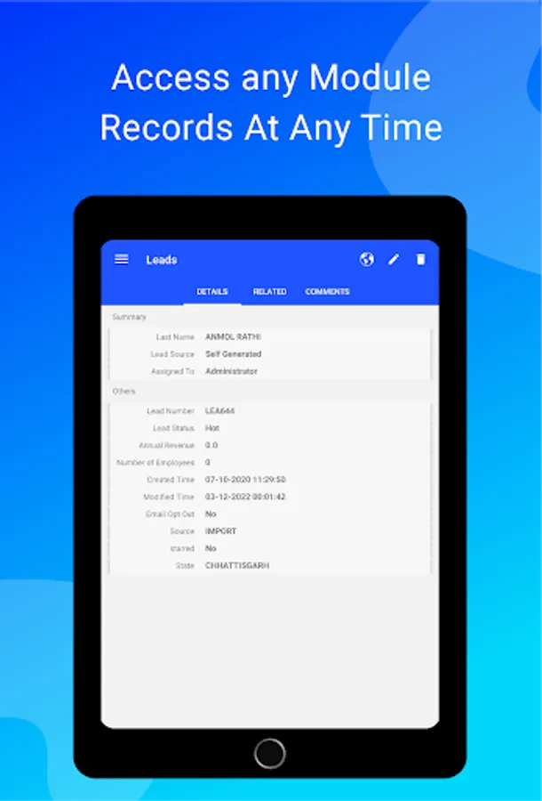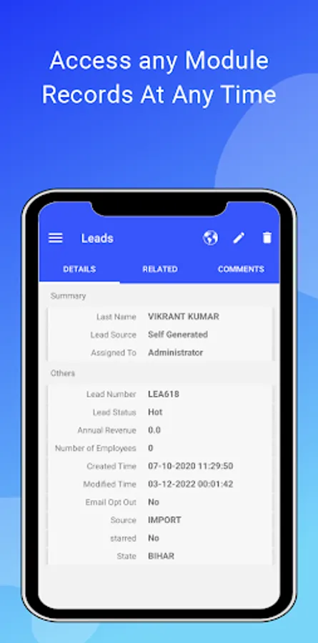 Gives the comfort to access CRM like you access when you’re at the desk. Create records like Contacts, Leads, or any other module record. Organize them by sorting records from newest to oldest. Delete, edit, or view at any time when you require.