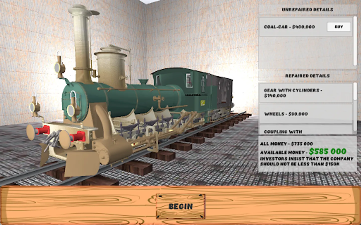 ‣ restore train — get money for completed tasks and buy the parts which you need;