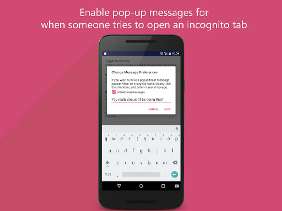 Configure the app to display a pop up alert when someone tries to open an Incognito Tab. This is a great way to give someone a reminder.