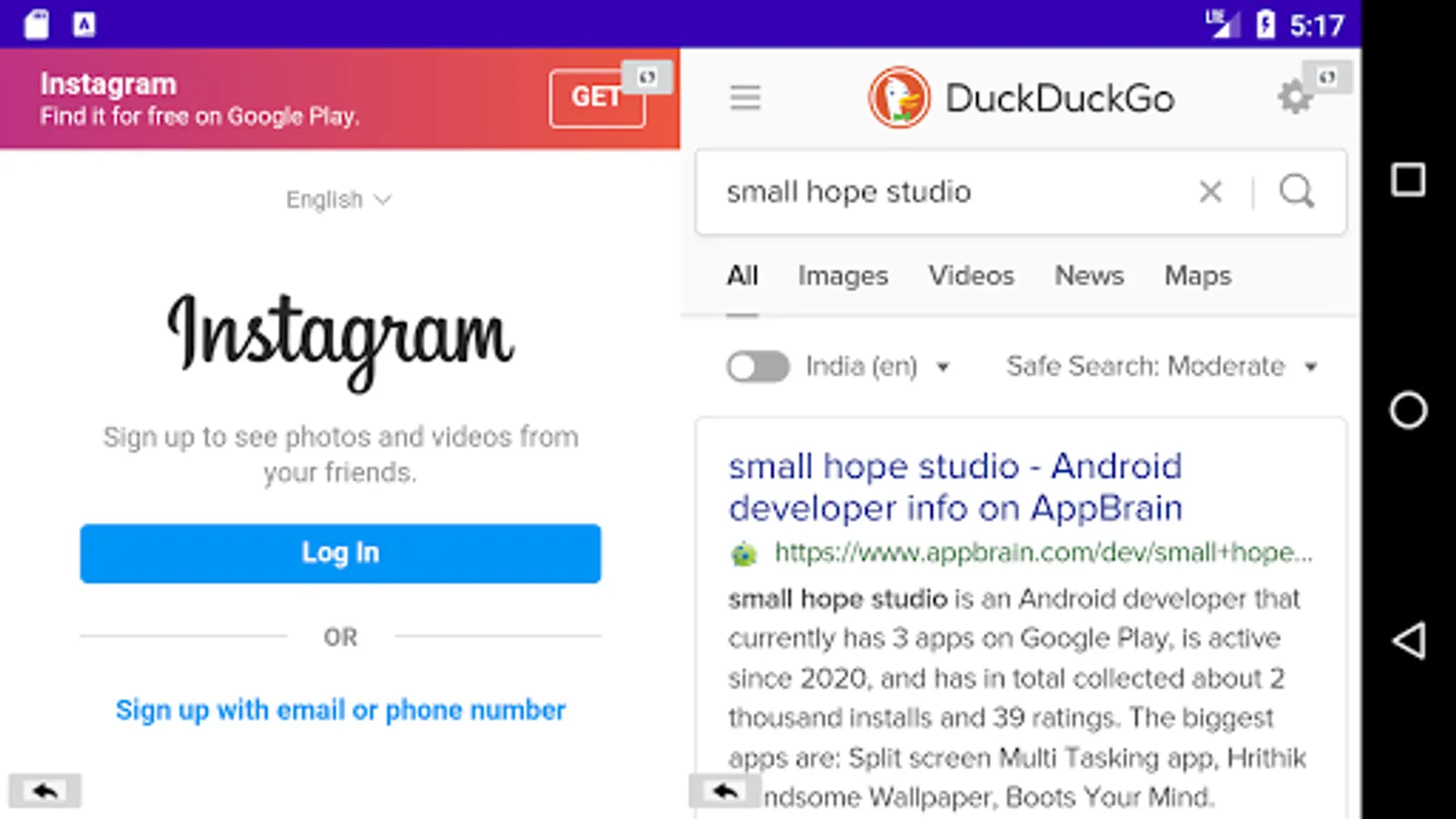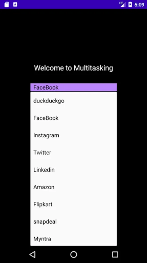 This Split screen Multi Tasking app can save your lots of time. It used to use Instagram, Facebook, Twitter, LinkedIn, duck duck go search, Amazon, Snapdeal, Flipkart, Myntra, Shopclues and Firstcry those applications any two combo can be access at same time for the entertainment and productively. Suppose you want to find the best deal in shopping site means it will very useful for you. At a time both applications are show to in a single screen.