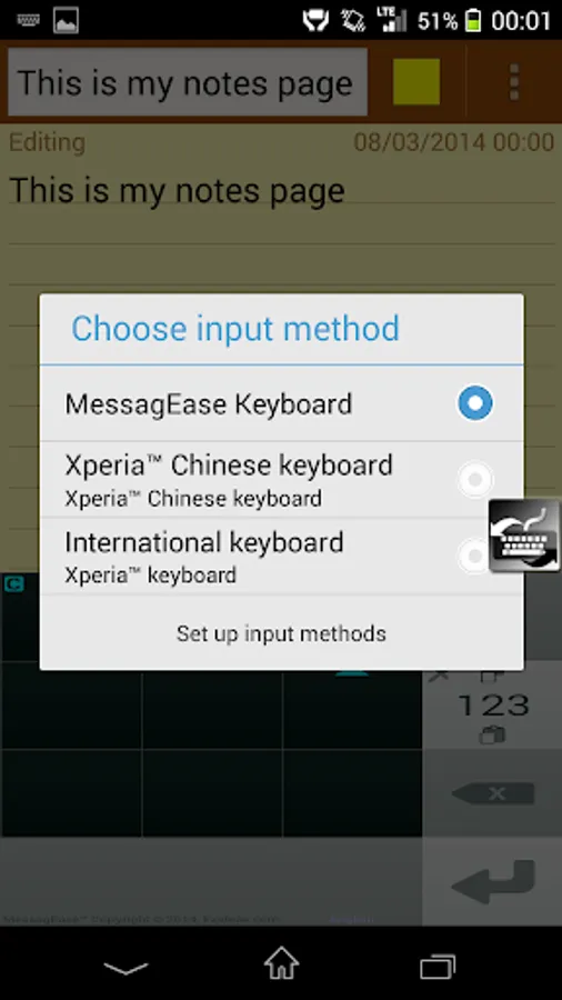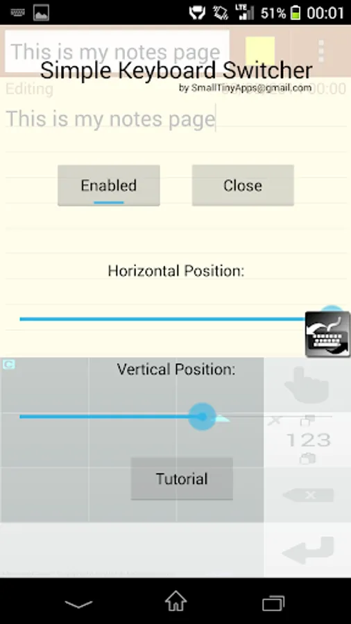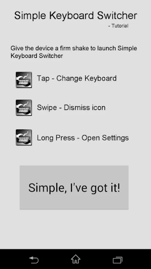 This is a simple and lightweight app which allows you to switch between any keyboard conveniently while typing. No need to swipe down the notifications panel or go to home page, just click on the floating button anytime you wish.