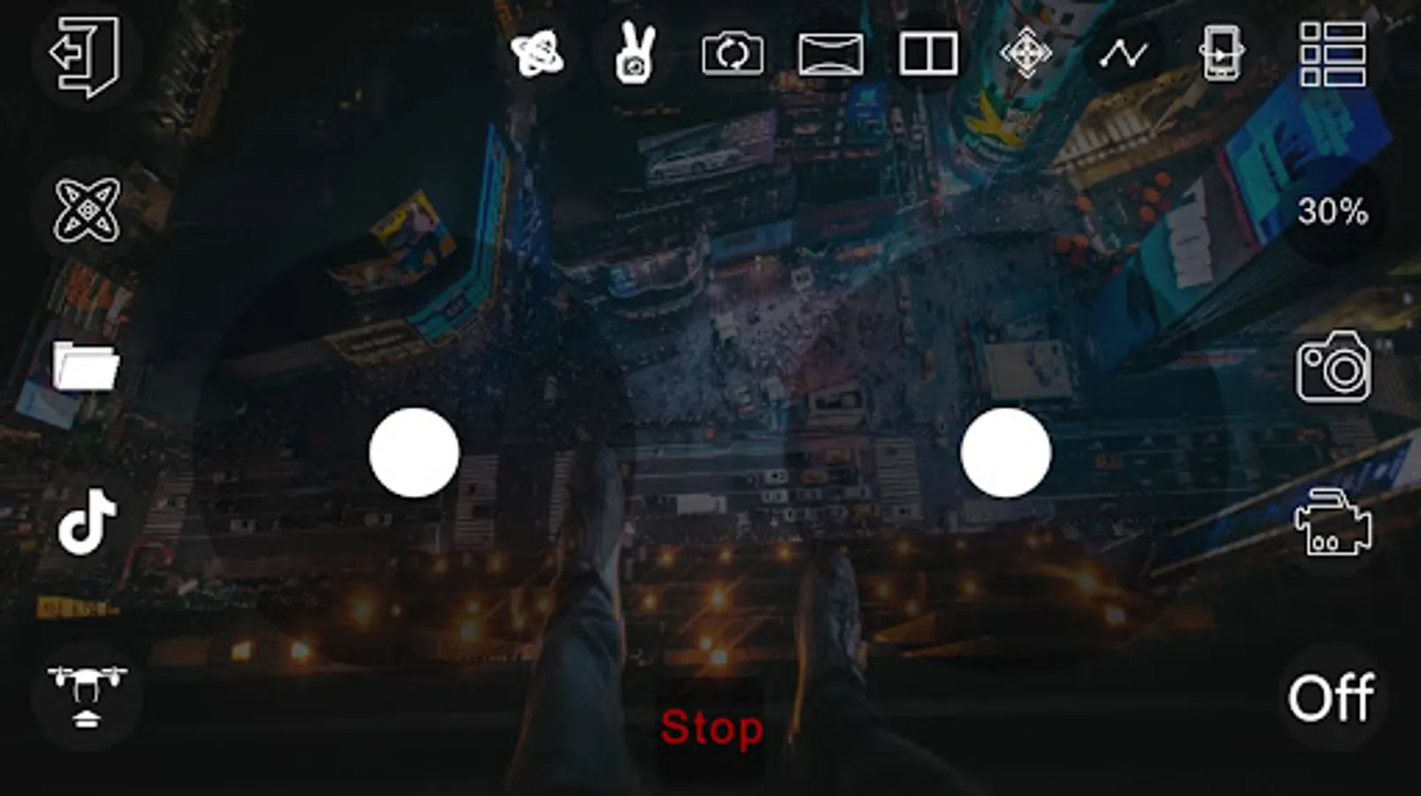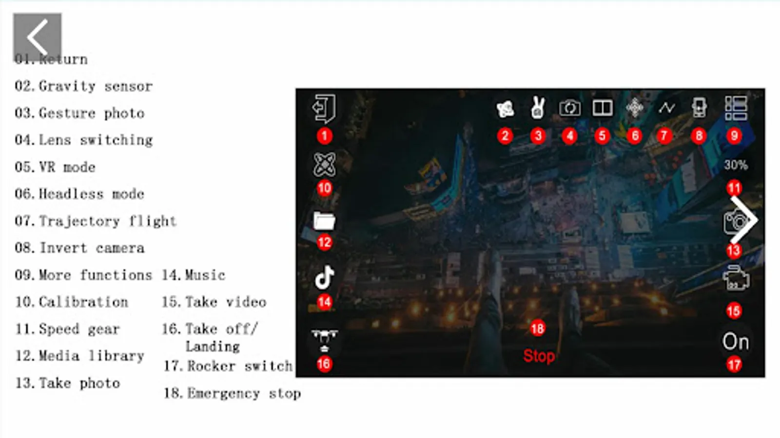 The APP connects to the drone through WiFi, and the virtual joystick in the APP can control the flight of the drone, take photos and video.