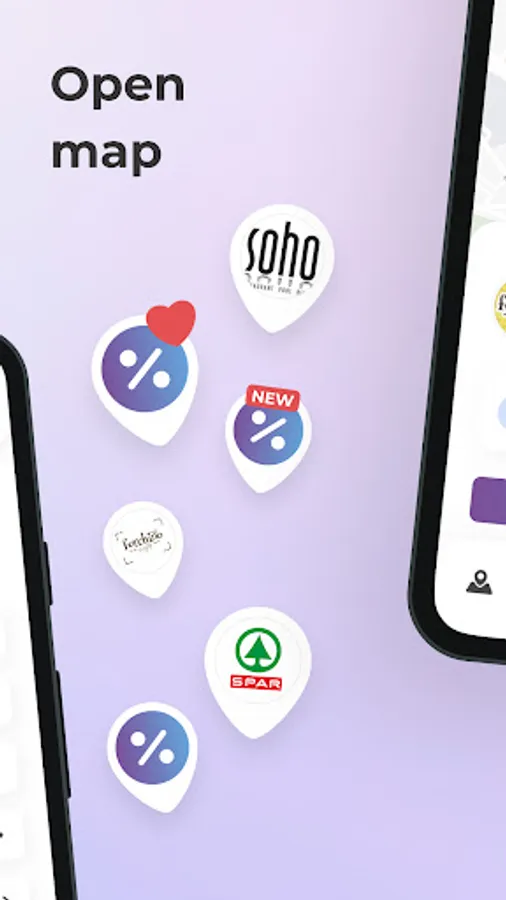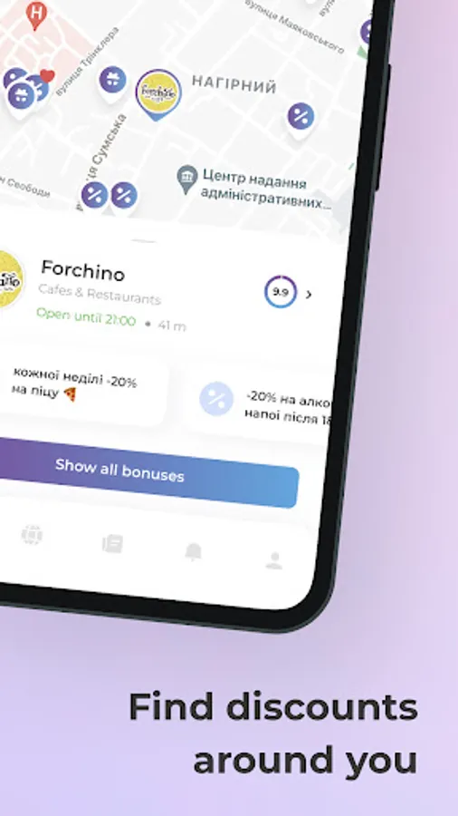 Turn on geolocation, open the map and see discounts around you, use search or choose categories for convenience. Go to online establishments to see discounts in online stores.