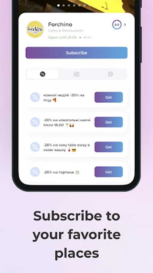 Subscribe to your favorite establishments to be able to receive notifications about new promotions and follow the news.