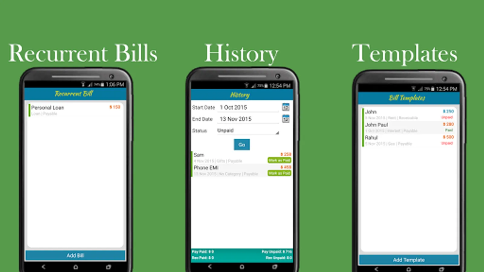 - Reminder about bills using Standard Notifcation or Dialog : Same day, one day before, two days before and a week before