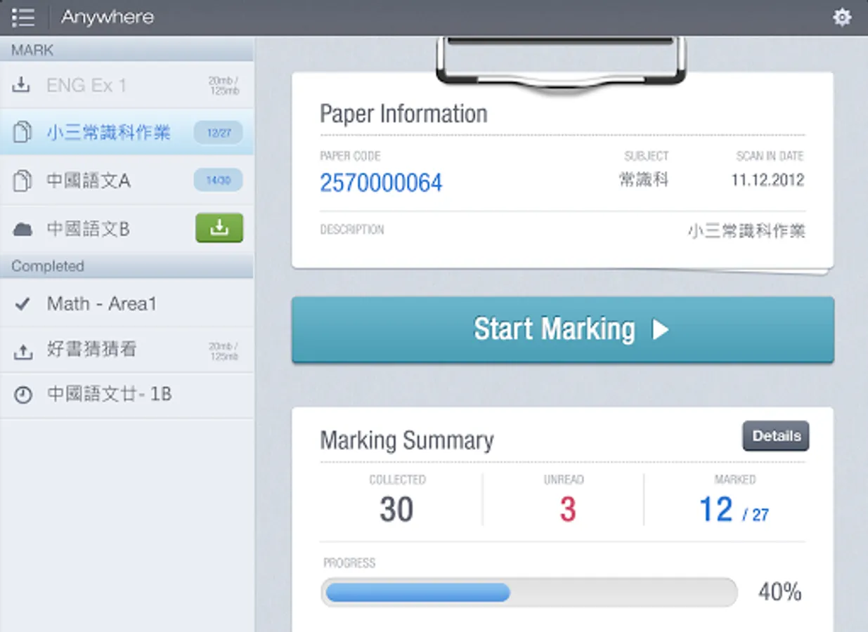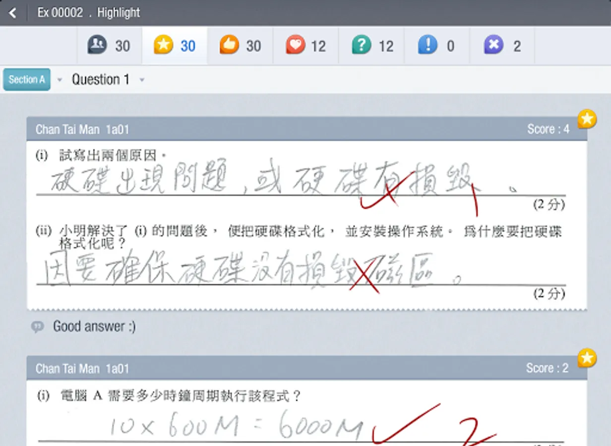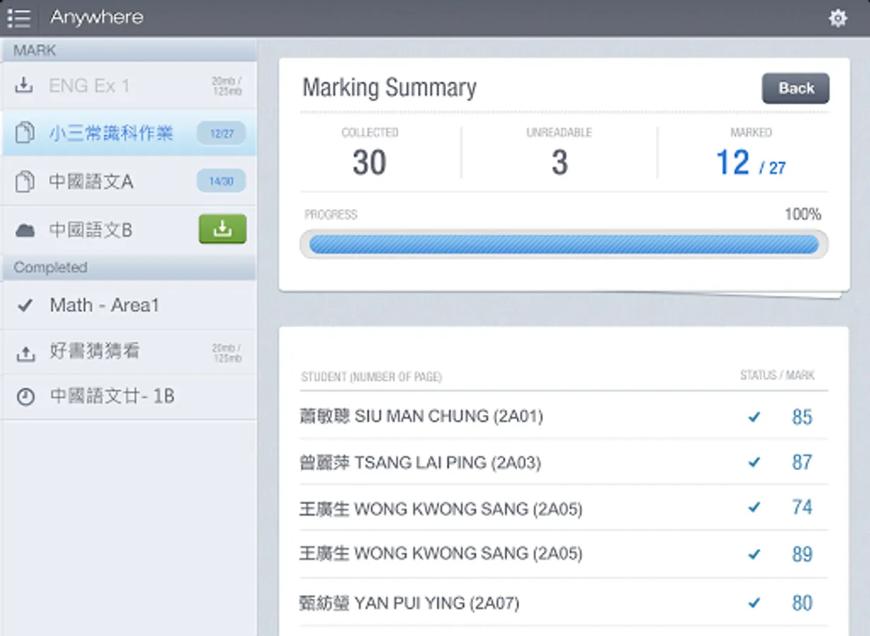 S-MARK 分為 Q-Bank 電子題目庫、Express 自動批改選擇題功能、Anywhere 流動批改開放式題目、Review & Analysis 四大模組;對比現時的電子化批改系統,只能應付預設了標準答案的題目,無法支援校本問題卷多樣化,更甚要處理大量批判性思考題目,亦難以再將結果生成統計分析,再與學生分享;加上紙本考核程序至今仍是校內必需而且常見。所以 S-MARK 的設計,先由 Express 著手,以條碼辨識 (Barcode Recognition) 去分辨學生身份,然後老師便可以經由平板電腦上的 Anywhere 下載換成了數碼影像的試卷,輕鬆地進行流動批改。由於 Anywhere上的工具因應了老師日常批改練習和考卷的習慣而設計,所以除了支援不同的分數計算方式外,更可以改卷專用的手勢控制 (Gesture Control) 和輕觸式書寫方法操作,令過程變得直觀易用,省卻了很多在過往人手於紙本上批改的繁複工序。完成平板電腦上的批改後,所有的結果便會回傳到雲端,再儲到學校的伺服器內供老師和學生查閱和分享之用。