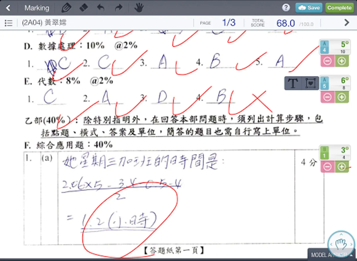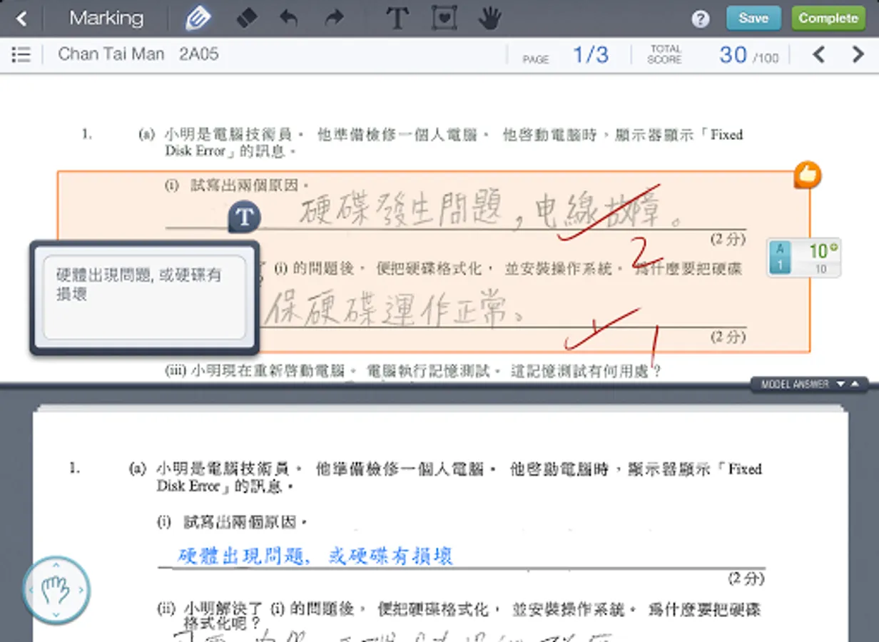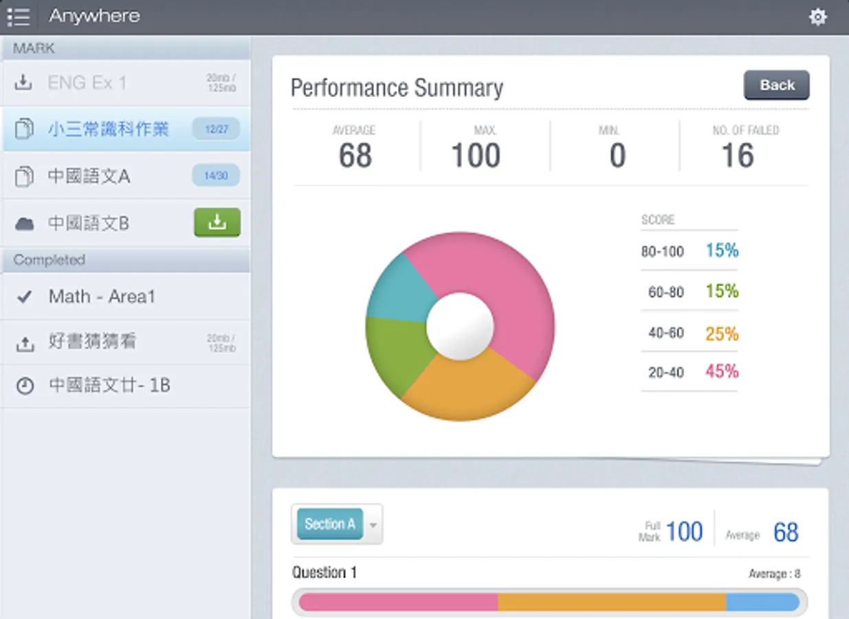 S-MARK 分為 Q-Bank 電子題目庫、Express 自動批改選擇題功能、Anywhere 流動批改開放式題目、Review & Analysis 四大模組;對比現時的電子化批改系統,只能應付預設了標準答案的題目,無法支援校本問題卷多樣化,更甚要處理大量批判性思考題目,亦難以再將結果生成統計分析,再與學生分享;加上紙本考核程序至今仍是校內必需而且常見。所以 S-MARK 的設計,先由 Express 著手,以條碼辨識 (Barcode Recognition) 去分辨學生身份,然後老師便可以經由平板電腦上的 Anywhere 下載換成了數碼影像的試卷,輕鬆地進行流動批改。由於 Anywhere上的工具因應了老師日常批改練習和考卷的習慣而設計,所以除了支援不同的分數計算方式外,更可以改卷專用的手勢控制 (Gesture Control) 和輕觸式書寫方法操作,令過程變得直觀易用,省卻了很多在過往人手於紙本上批改的繁複工序。完成平板電腦上的批改後,所有的結果便會回傳到雲端,再儲到學校的伺服器內供老師和學生查閱和分享之用。