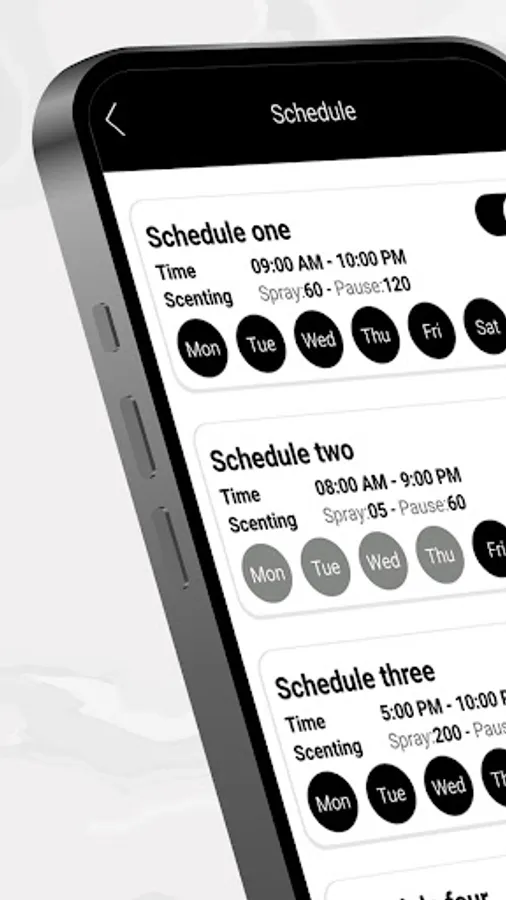 Schedule scenting sessions to automatically trigger at specific times, ensuring that your space is always filled with the perfect aroma when you need it most.