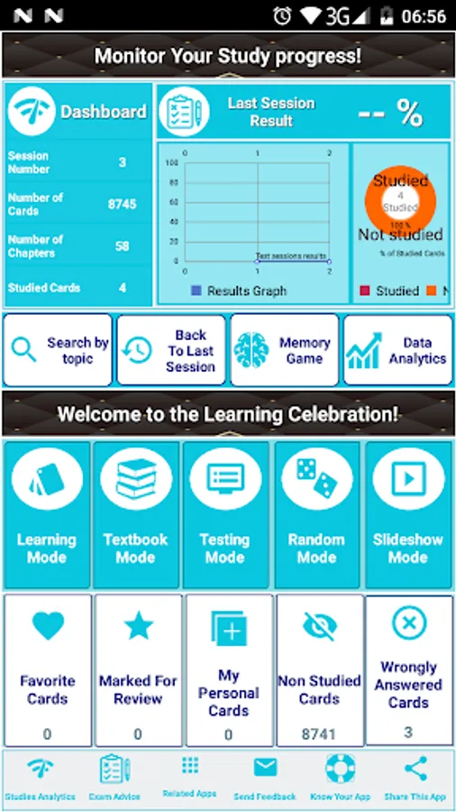 - Five study Modes (learning mode, handout mode, test mode, slideshow mode and random mode).