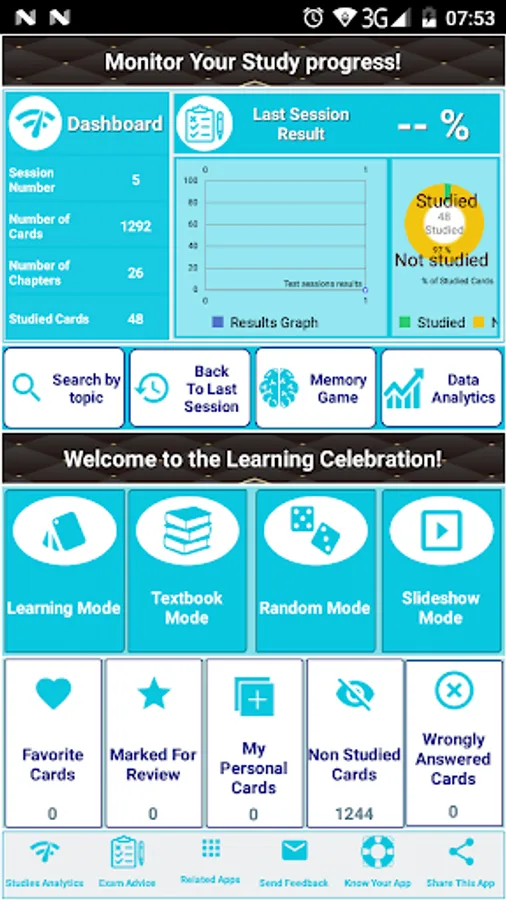 - Five study Modes (learning mode, handout mode, test mode, slideshow mode and random mode).