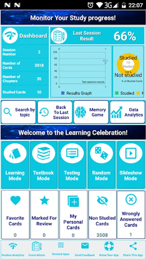 - Five study Modes (learning mode, handout mode, test mode with MCQs, slideshow mode & random mode).