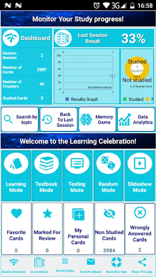 - Five study Modes (learning mode, handout mode, test mode, MCQs, slideshow mode and random mode).