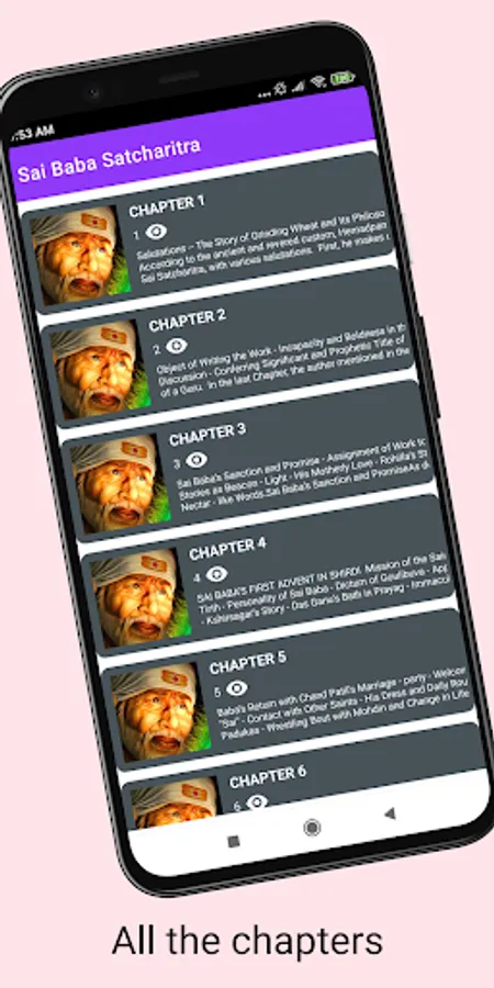This android app Shri Sai SatCharitra Parayan which includes all adhyay / stories in all language. You can use this app when you dont have any big book for Sai Charitra Parayan. You can read it any time whenever you are away from home or at home also. The Sai Satcharitra is a discourse based on experiences Baba’s devotees had with Him during His life on earth. It is said that Shirdi Sai Baba caused it to be written through Shri Anna Saheb Dabholkar - Hemadpant - by giving inner motivation to him. Baba had clearly told him: "I Myself write my own life. Hearing My stories and teachings will create faith in devotees' hearts and they will easily get self-realization and bliss...." Every chapter is a mixture of philosophy, anecdotes, and teachings. His book is akin to the Vedas for Sai’s devotees.” To many people, The Divine Truth imparted by this book is even greater than the knowledge contained in the Vedas and the Gita, because all the characters and events in it are real and authentic and have been recorded in detail by many devotees.