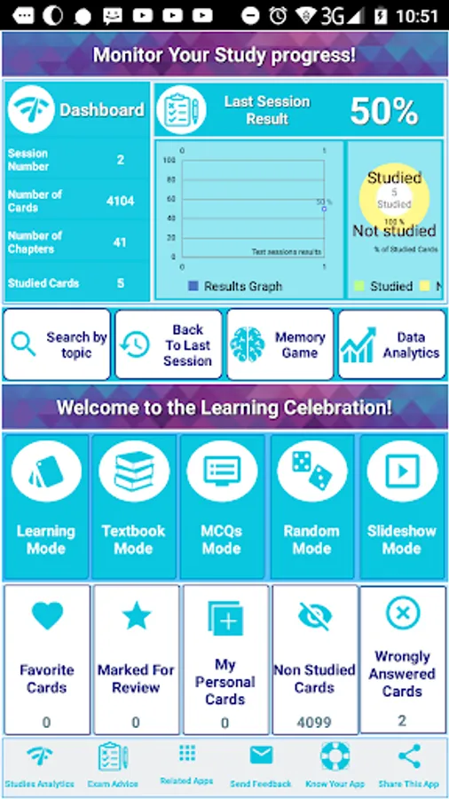 - Six study Modes (learning mode, handout mode, test mode with MCQs, slideshow mode, random mode & Game Memory mode)