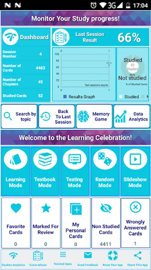 - Six study Modes (learning mode, handout mode, test mode with MCQs, slideshow mode, random mode & Game Memory mode)