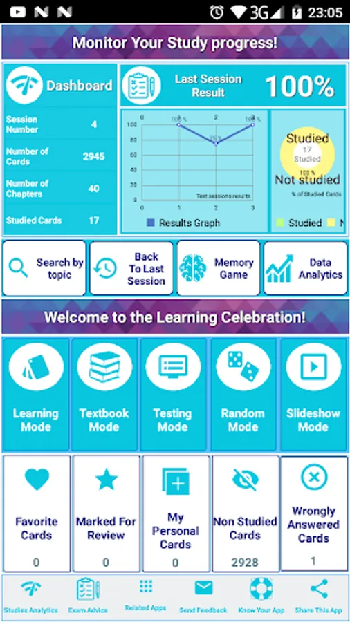 - Six study Modes (learning mode, handout mode, test mode with MCQs, slideshow mode, random mode & Game Memory mode)