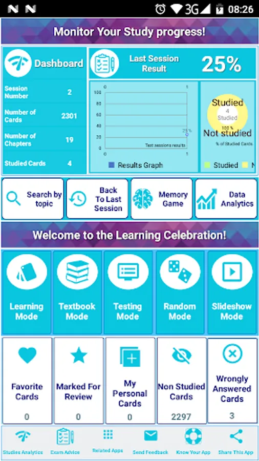 - Six study Modes (learning mode, handout mode, test mode with MCQs, slideshow mode, random mode & Game Memory mode)